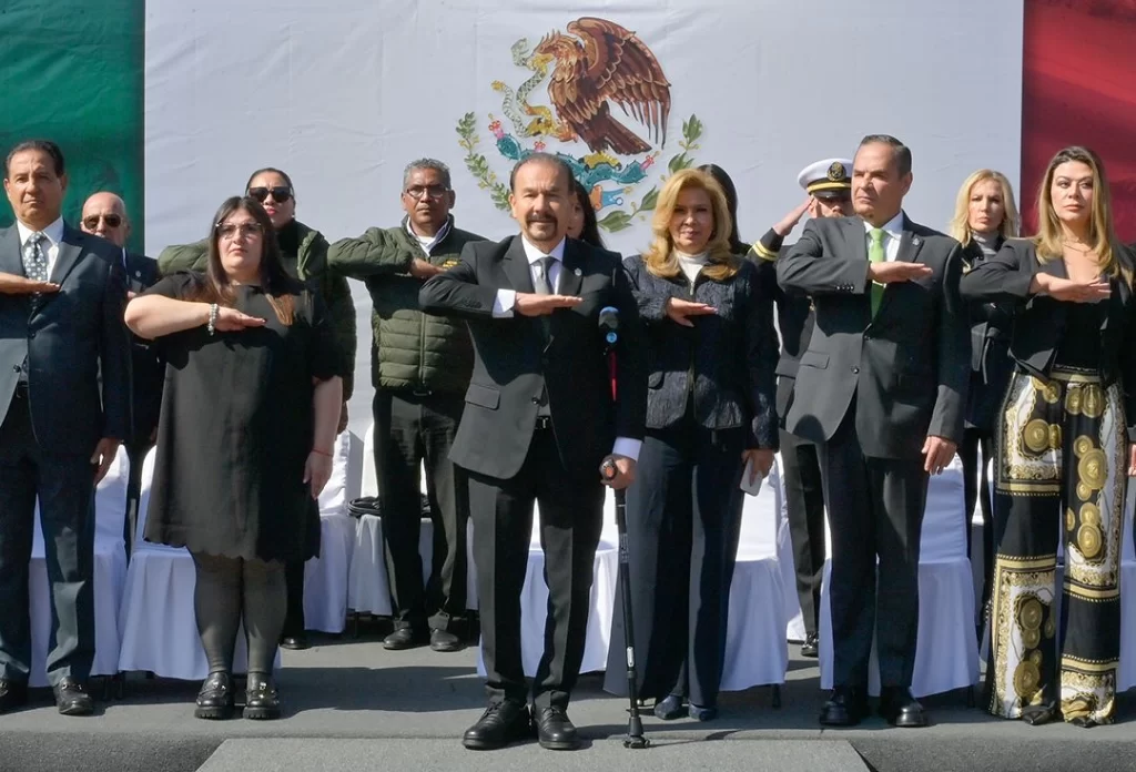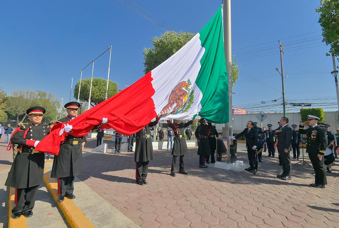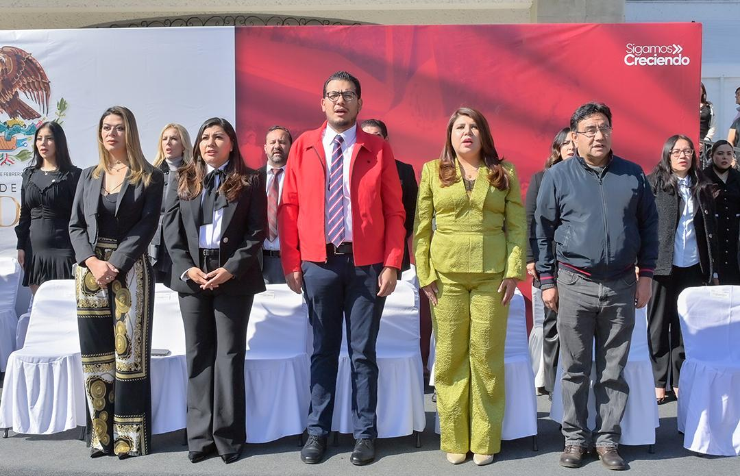 Durante la ceremonia estuvo acompañado por la presidenta honoraria del Sistema Municipal DIF, Paty Arévalo; integrantes del Cabildo; directores de la administración municipal y representantes del SUTEyM, quienes rindieron honores al símbolo que representa la historia, lucha y unidad del pueblo mexicano.