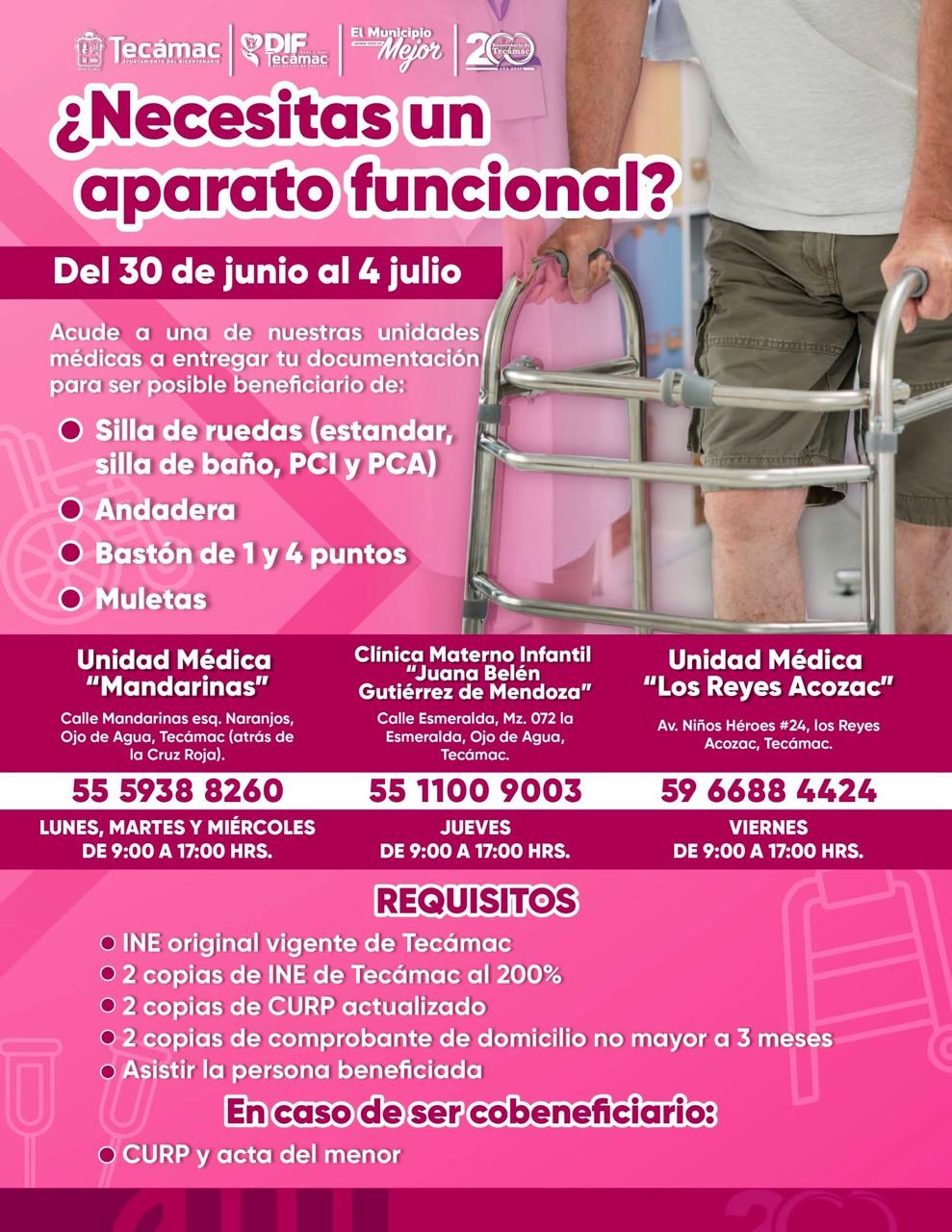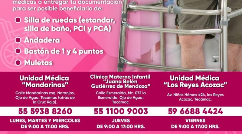 TECÁMAC, México.- A partir de este lunes y hasta el próximo viernes, el Sistema Municipal DIF de Tecámac recibirá los documentos para solicitar la entrega de aparatos funcionales, como sillas de ruedas (estándar, sillas de baño, PCI y PCA), andadera, bastón de uno y cuatro puntos y muletas.