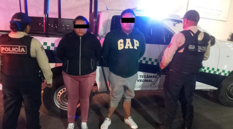 TECÁMAC, México.- Elementos de la Guardia Civil detuvieron a una pareja que presuntamente se dedicaba a extorsionar y amenazar a vecinos de distintas colonias, y a quienes se les aseguraron dos armas de fuego al momento de su captura.