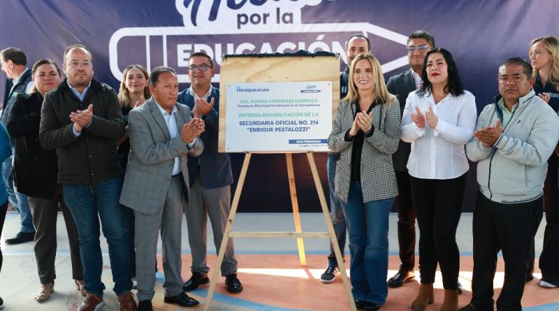 HUIXQUILUCAN DE DEGOLLADO, México.- Con el Programa “Acción por la Educación”, se busca brindar espacios dignos a estudiantes para impulsar su desarrollo académico, por lo que se rehabilitan todas las escuelas que hay en el municipio, así lo aseguró la presidenta municipal, Romina Contreras Carrasco, durante la entrega de las instalaciones de la Escuela Secundaria “Enrique Pestalozzi”, ubicada en la colonia San Fernando, que recibió servicio de  aplicación de pintura, mantenimiento en sanitarios, colocación de losetas y jardinería, entre otros trabajos, como parte de la segunda etapa del programa.