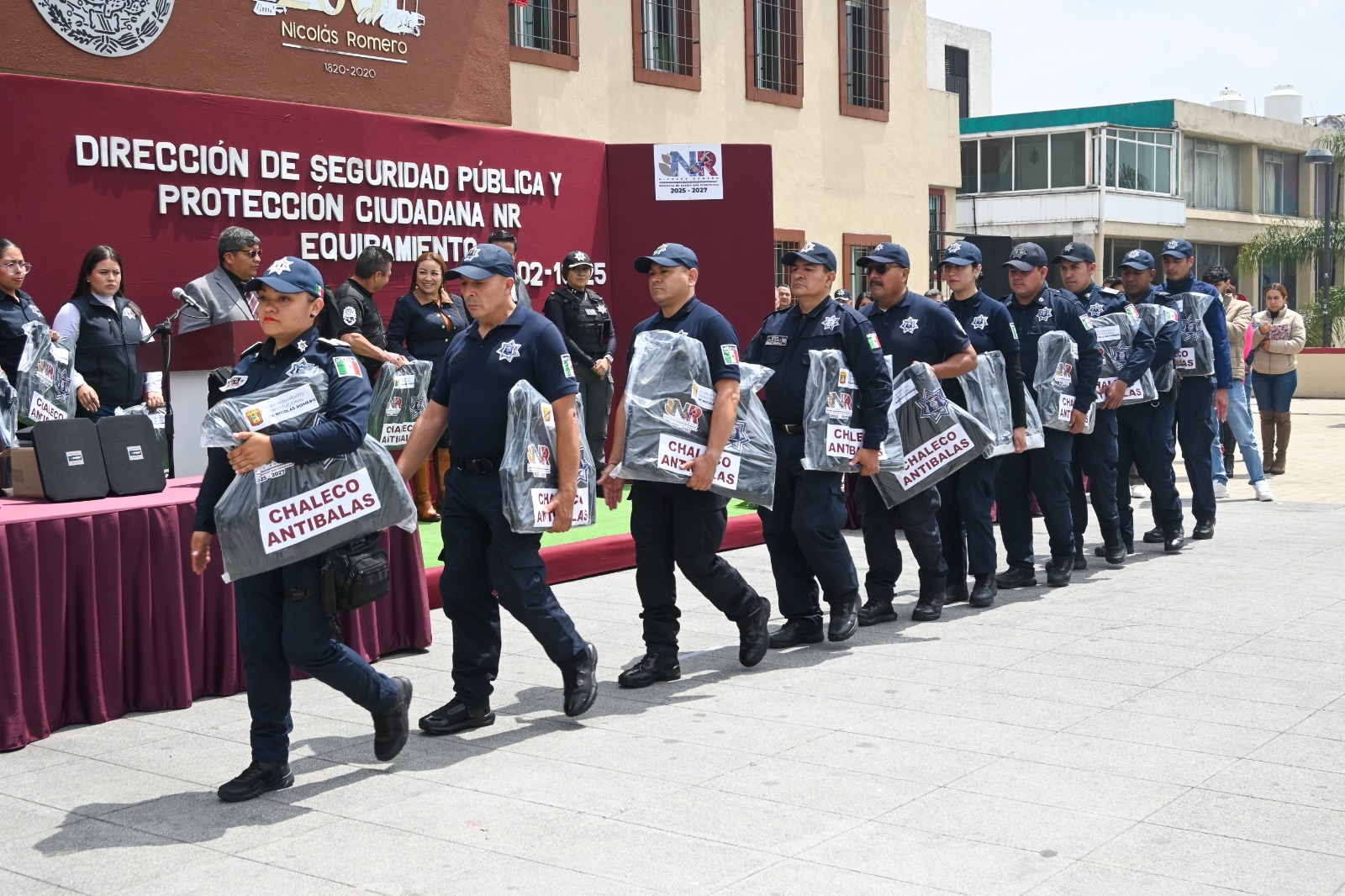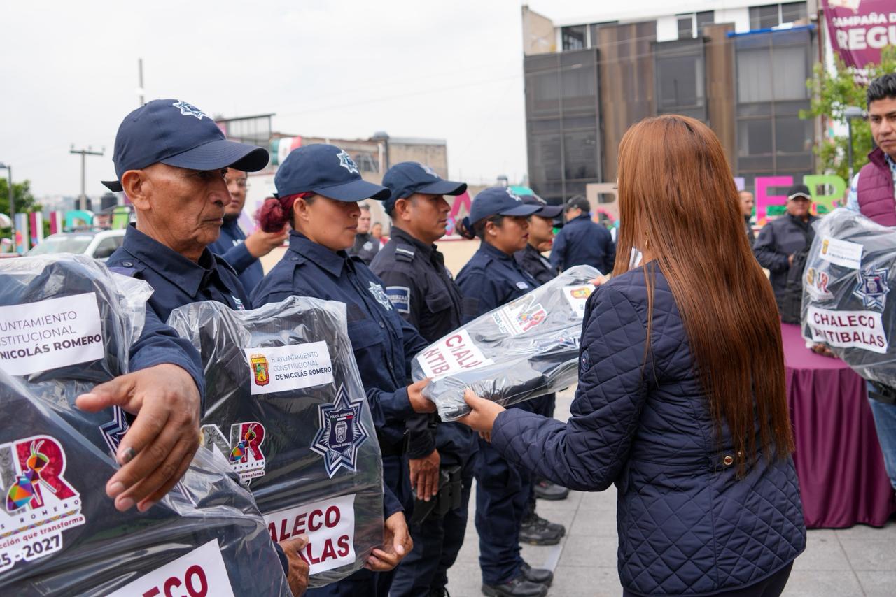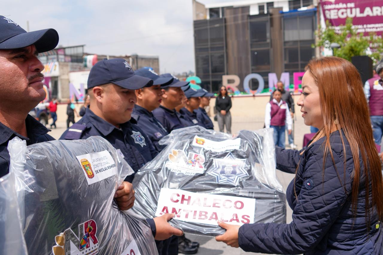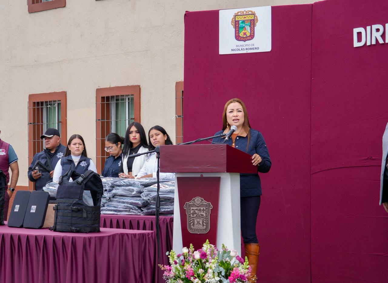 NICOLÁS ROMERO, México.– “Vamos a seguir trabajando por consolidar la paz social en Nicolás Romero, cueste lo que nos cueste”, expresó la alcaldesa Yoselin Mendoza al encabezar la entrega de 210 chalecos balísticos a elementos de la Dirección de Seguridad Pública y Protección Ciudadana.