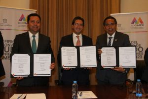 *** El dirigente estatal del SMSEM, Marco Aurelio Carbajal, Rodrigo Jarque y Gerardo Monroy, encabezaron la firma del Convenio de...