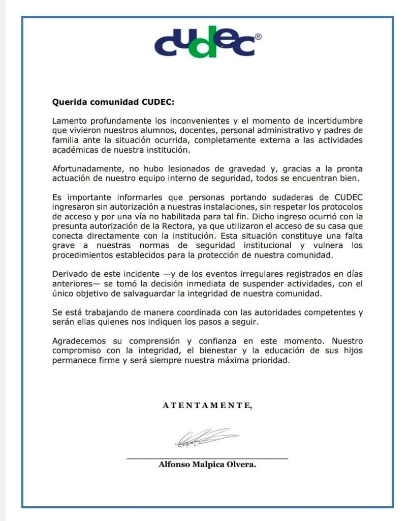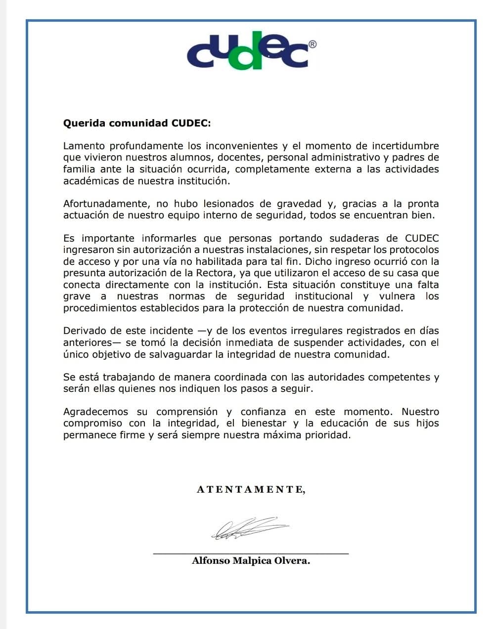 TLALNEPANTLA DE BAZ, México.- Luego de los hechos lamentables ocurridos en el interior de CUDEC, el vicerrector del Grupo Educativo, Alfonso Olvera Malpica emitió un comunicado dirigido a la comunidad CUDEC para informar de lo ocurrido: