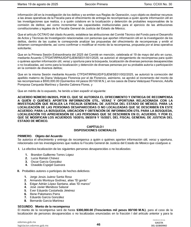La recompensa fue publicada en el Acuerdo 06/2025 de la Gaceta de Gobierno, que también contempla incentivos económicos por información sobre personas desaparecidas, como Brandon Guillermo Torres López y Lucía Román Chávez, ausentes desde 2019 y 2017, respectivamente, en ella se detalla que la recompensa será entregada únicamente a quien aporte información útil y verificable.